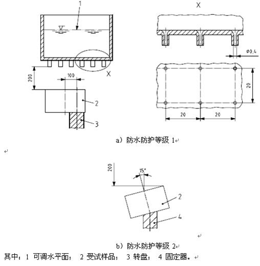 防水試驗包括第二伴特征數(shù)字為1至8,即防護(hù)等級代碼為IPX1至IPX8