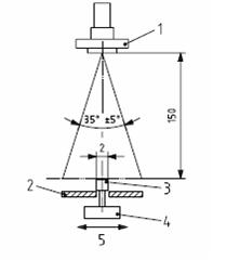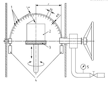 1 直徑D的孔;2 受試樣品;3 轉(zhuǎn)盤;4平衡量; 5流量指示器和壓力計;r200,400,600或800;按受試樣品尺寸選擇最小的半徑; D = 0.4防水防護(hù)等級3和4;D = 0.8防水防護(hù)等級4K; 受試樣品的速度(1~3)min-1。