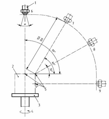 1 鼓風(fēng)噴射噴嘴;2 受試樣品;3 轉(zhuǎn)臺;4 轉(zhuǎn)軸; 5 參考點(0°,30°,60°,90°)對受試樣品柱面分面;6 位置1;7 位置2;8 位置3;9 位置4;