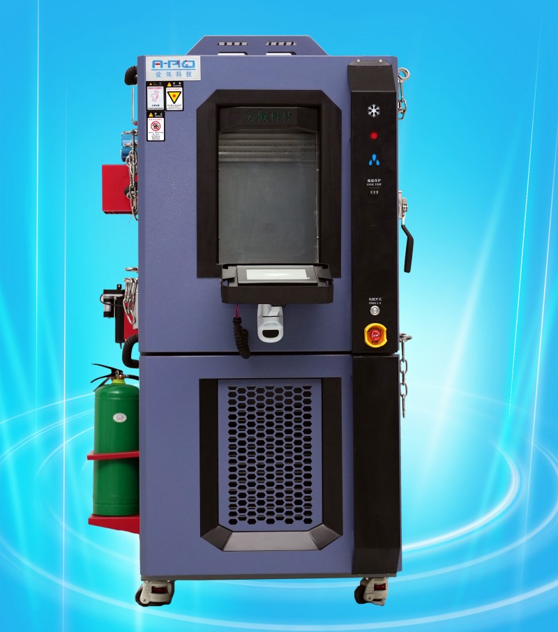 愛佩生產的鎳氫電池恒溫恒濕試驗箱防爆原理:利用滅火器及噴水進行雙重滅火,泄壓輔助達到防爆目的,若樣品在設備內箱測試過程中發生爆裂,產生的煙霧第一時間會啟動防爆系統,經由內部抽氣泵排入裝煙感器的罩子內,感應后即觸發滅火器開關,滅火器內干冰噴入內箱進行滅火,緊接著噴淋裝置噴水再進行二次滅火。當內箱氣壓過大時,泄壓孔會被沖開,即完成泄壓工作。