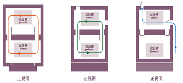 三箱設(shè)備區(qū)分為高溫區(qū)、低溫區(qū)、測(cè)試區(qū)三部分,測(cè)試樣品完全靜止于測(cè)試區(qū)。采用獨(dú)特之蓄熱、蓄冷結(jié)構(gòu),強(qiáng)制冷熱風(fēng)路切換方式導(dǎo)入測(cè)試區(qū),沖擊時(shí)高溫區(qū)或低溫區(qū)的溫度沖入測(cè)試區(qū)進(jìn)行沖擊,完成冷熱溫度沖擊測(cè)試。