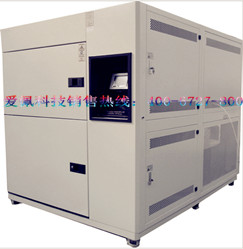 • 提籃式冷熱沖擊試驗箱也叫兩箱式冷熱沖擊試驗箱或者二箱式冷熱沖擊試驗箱,它的結構與三箱式冷熱沖擊試驗箱的不同之處就是擺放測試物的區域是一個由不銹鋼做成的提籃,藍子內分為兩層格層用于擺放產品。設備在做沖擊試驗時通過氣缸拉伸提籃在冷溫區和熱溫區中間來回竄動從而達到沖擊效果。當用戶在做冷沖擊時提籃會被提到冷溫儲溫箱,當用戶在做熱沖擊設定時提籃會被提到熱溫儲溫箱,當然這些移動工作是在10秒鐘之內完成的,穩定時間在3~5分鐘以內,完全能達到國家標準。(為了保證試驗箱降溫速率和最低溫度的要求,本試驗箱采用一套進口德國半封閉壓縮機所組成的二元復疊式水冷制冷系統(需在室外安裝每小時冷卻水量為10噸的循環冷卻水塔,由愛佩提供)。復疊式制冷系統包含一個高溫制熱循環和一個低溫制冷循環,其連接容器為蒸發冷凝器,蒸發冷凝器是也到能量傳遞的作用,將工作室內熱能通過兩級制冷系統傳遞出去,實現降溫的目的。制冷系統的設計應用能量調節技術,一種行之有效的處理方式既能保證在制冷機組正常運行的情況下又能對制冷系統的能耗及制冷量進行有效的調節,使制冷系統的運行費用和故障率下降到較為經濟的狀